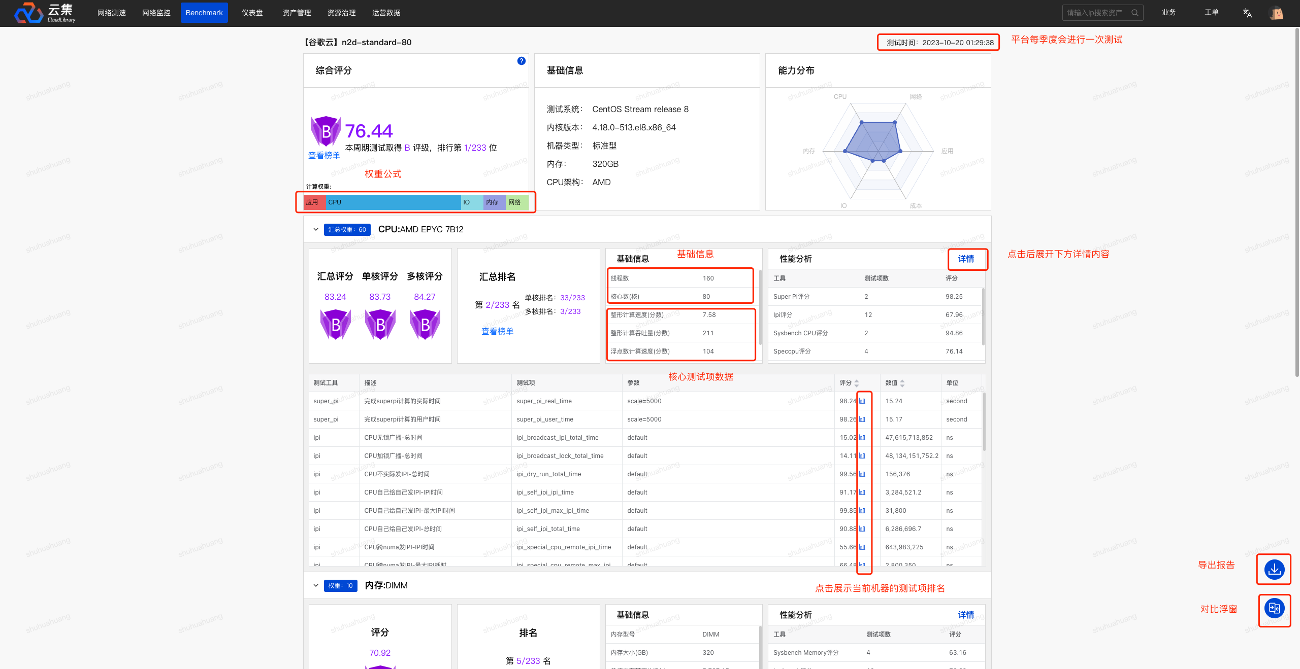 - 性能分析:展示参与测试的各个工具的汇总评分。点击详情之后可展开每个工具的具体测试项数值与评分。